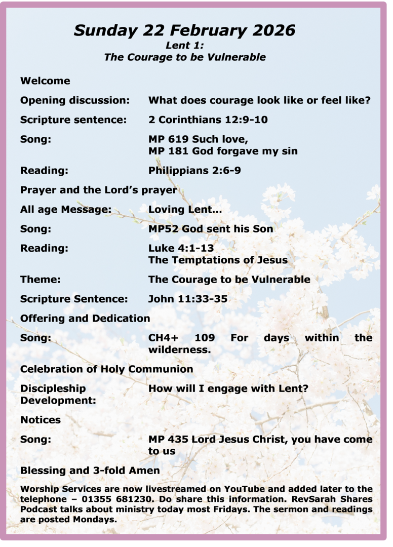 Rev Sarah is on annual leave from Tues 3-Tues 10 Mar inclusive. Rev K Mackenzie is covering pastoral.